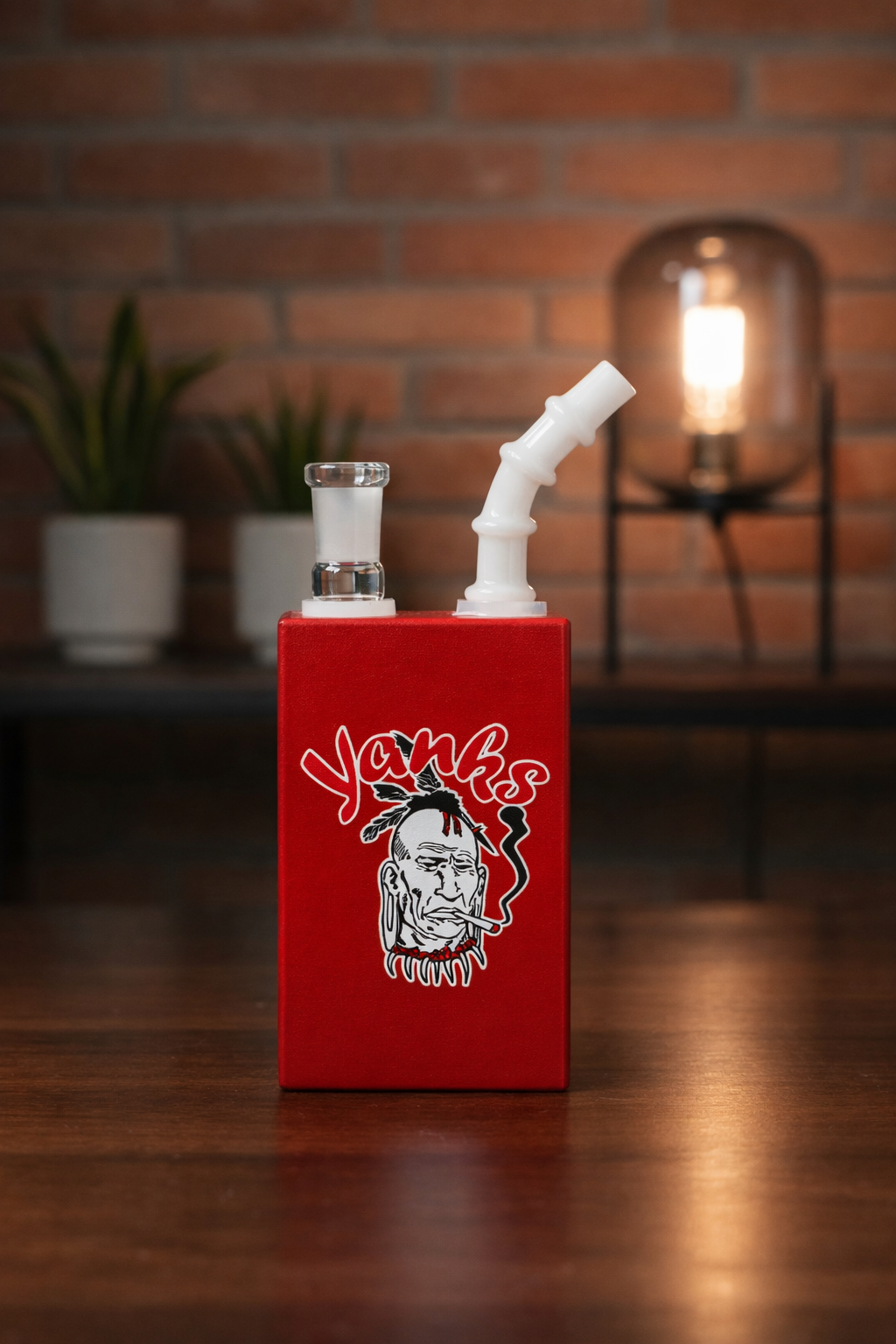 Compact acrylic and glass water pipe printed with the Yanks logo.